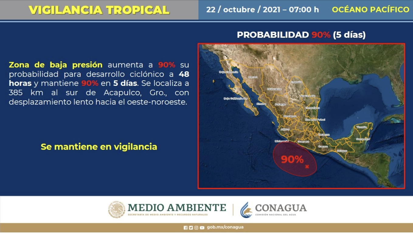 En su más reciente parte informativo la Comisión Nacional del Agua informa que la zona de Baja Presión que se presenta desde hace varios días en el Pacífico mexicano a aumentado a un 90% de posibilidades de que evolucione en ciclón en las próximas 48 horas, por lo que recomienda a la ciudadanía extremar sus precauciones.
