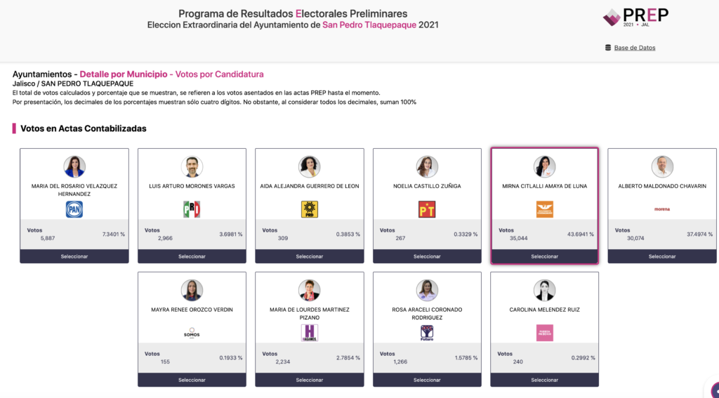 Con el 77.3% de las actas capturado hasta las 23:39 horas, la candidata por Movimiento Ciudadano, Citlalli Amaya, se posiciona a la delantera con un total de 35 mil 044 votos computados, seguida por el candidato de Morena, Alberto Maldonado, con 30 mil 074 sufragios. En tercer lugar se ubicó, hasta esa hora, la candidata por el PAN, María del Rosario Velázquez, con cinco mil 887 votos contabilizados por el PREP.