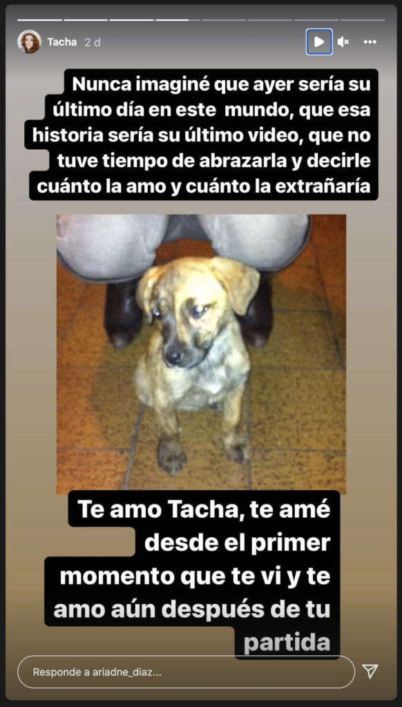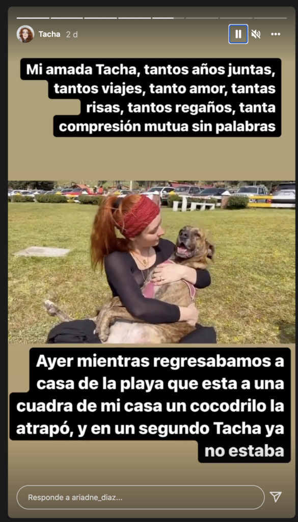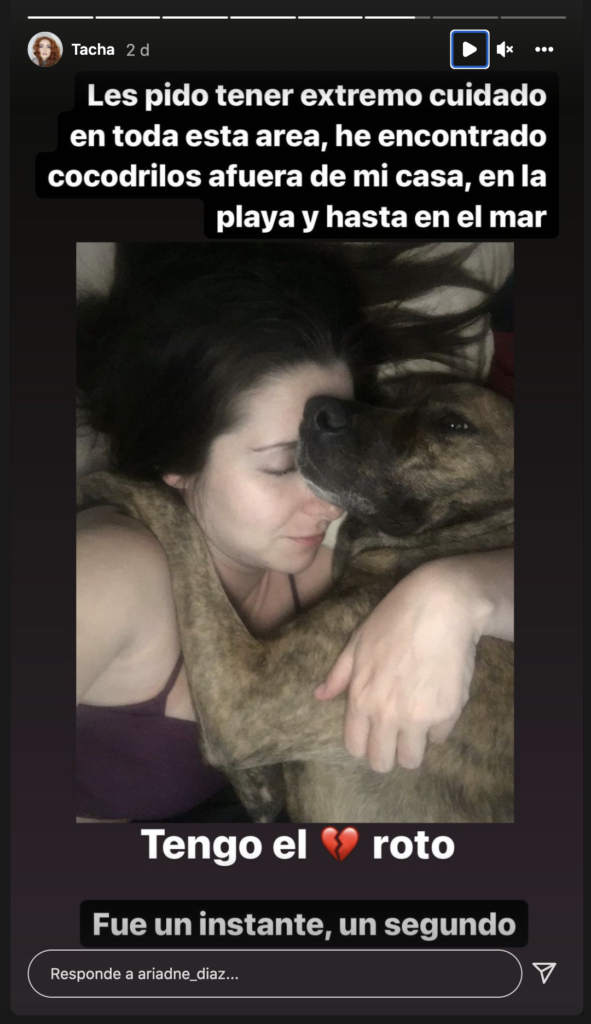 «Ayer mientras regresábamos de la playa que está a una cuadra de mi casa, un cocodrilo la atrapó y en un segundo Tacha ya o estaba», publicó en su Instagram el pasado 20 de diciembre, quien se dolió de que «ese sería su último día en este mundo, el último video, que no tendría tiempo de abrazarla y decirle cuanto la amo y cuánto la extrañaría».