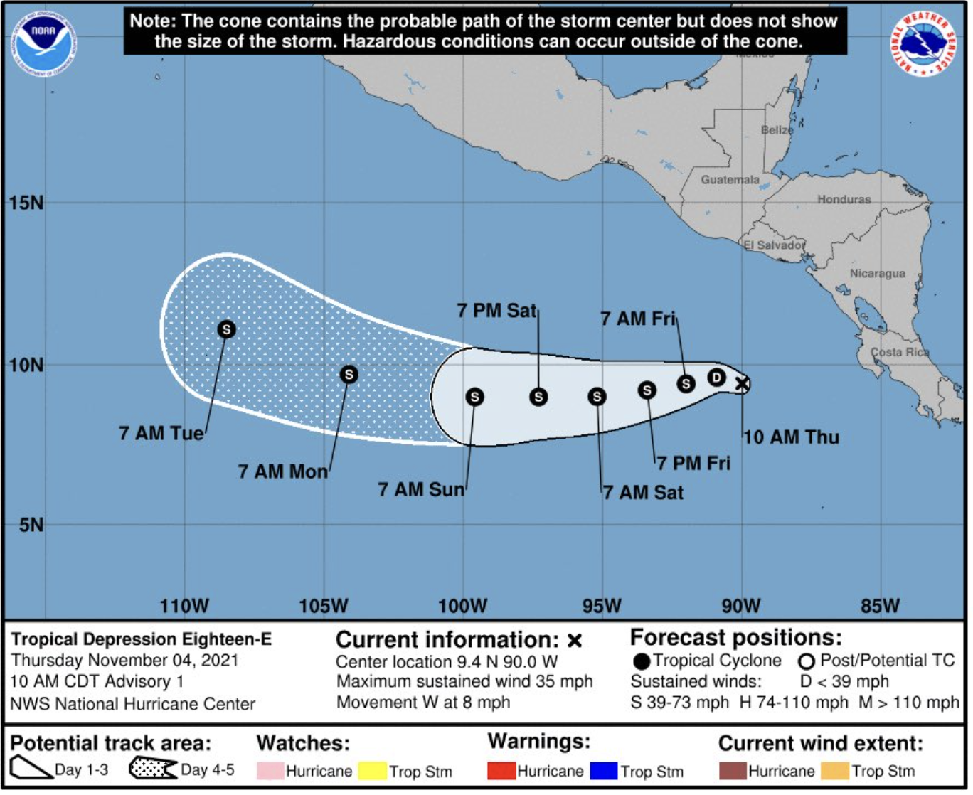 Este jueves se desarrolló en la depresión tropical dieciocho-E al sur del Pacífico mexicano que en las próximas horas podría convertirse en tormenta tropical, informó el Servicio Meteorológico Nacional.