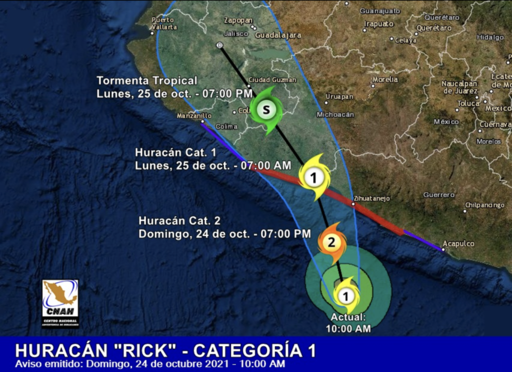 Recientemente en imágenes de satélite se observa una explosión convectiva sobre el centro del sistema, por lo que se mantiene en vigilancia.La trayectoria oficial del Centro Nacional de Huracanes (NHC) determina un ingreso a tierra sobre los límites de #Michoacán–#Guerrero como un huracán sobre la madrugada del lunes, 25 de octubre. Los efectos comenzarán durante esta noche.