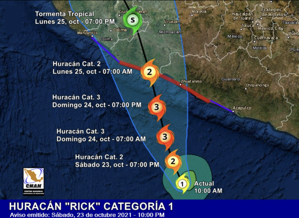 Se acuerdo con el parte informativo de las 11 de la mañana de este sábado emitido por el Centro Nacional de Advertencia de huracanes en caso de mantenerse la trayectoria actual el huracán Rick tocaría tierra durante la mañana del próximo lunes en las cosas de Michoacán con categoría 2.
